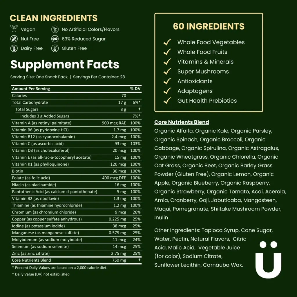 Grüns is plant-based and vegan. These gummies are free from gluten, dairy, and nuts. 63% reduced added sugar. No artificial additives.